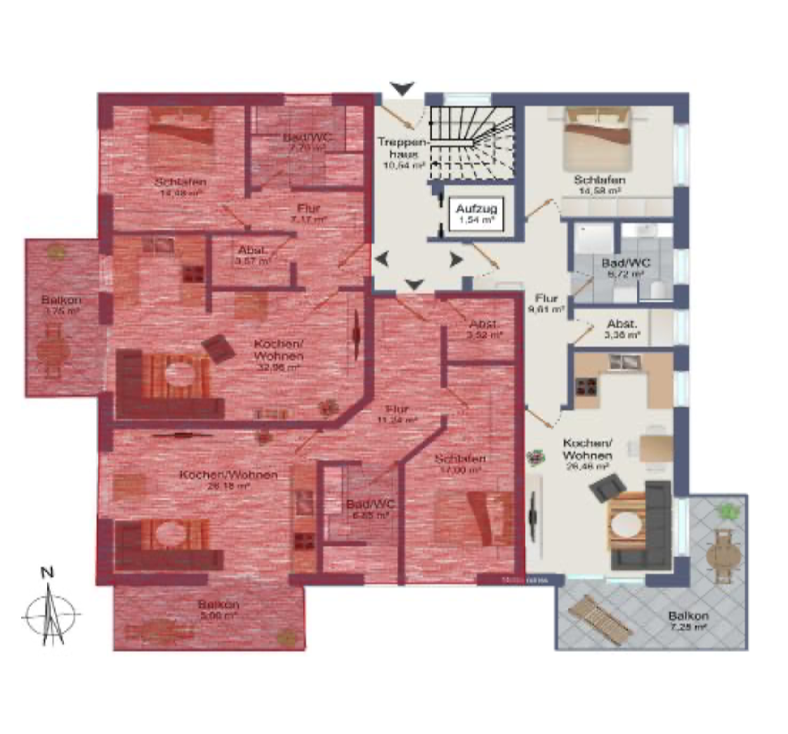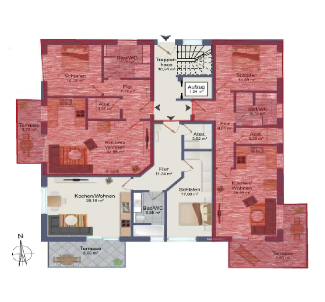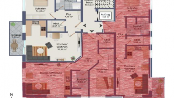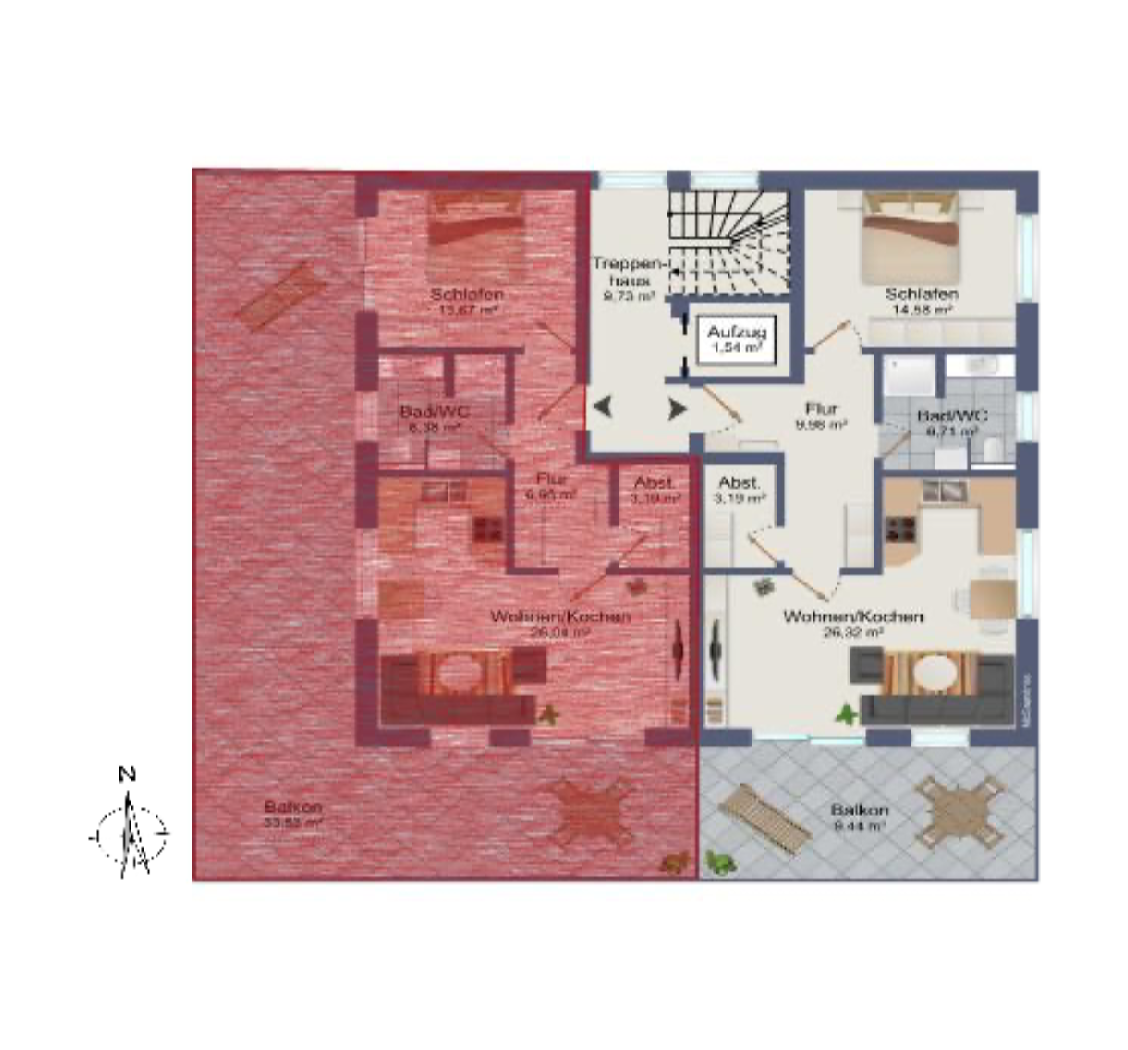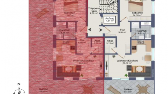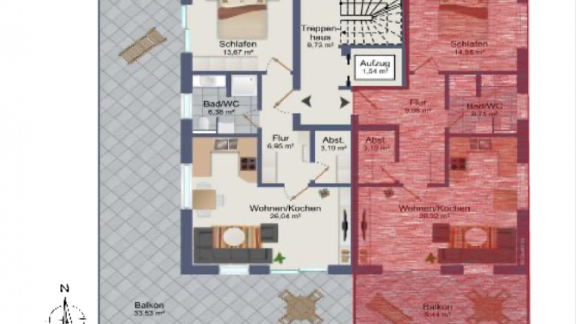 Die geräumigen 2 – 3,5 Zimmerwohnungen mit 68 qm – 98,45 qm bieten eine Terrasse oder einen Balkon mit schönem Ausblick. Alternativ kann das Dachgeschoss jeweils auch als große Penthouse-Wohnung mit ca. 163 qm bzw. 175 qm Wohnfläche ausgebaut werden. Alle Wohnungen sind über eine Aufzugsanlage barrierefrei von der Tiefgarage bis zum Dachgeschoss erreichbar.