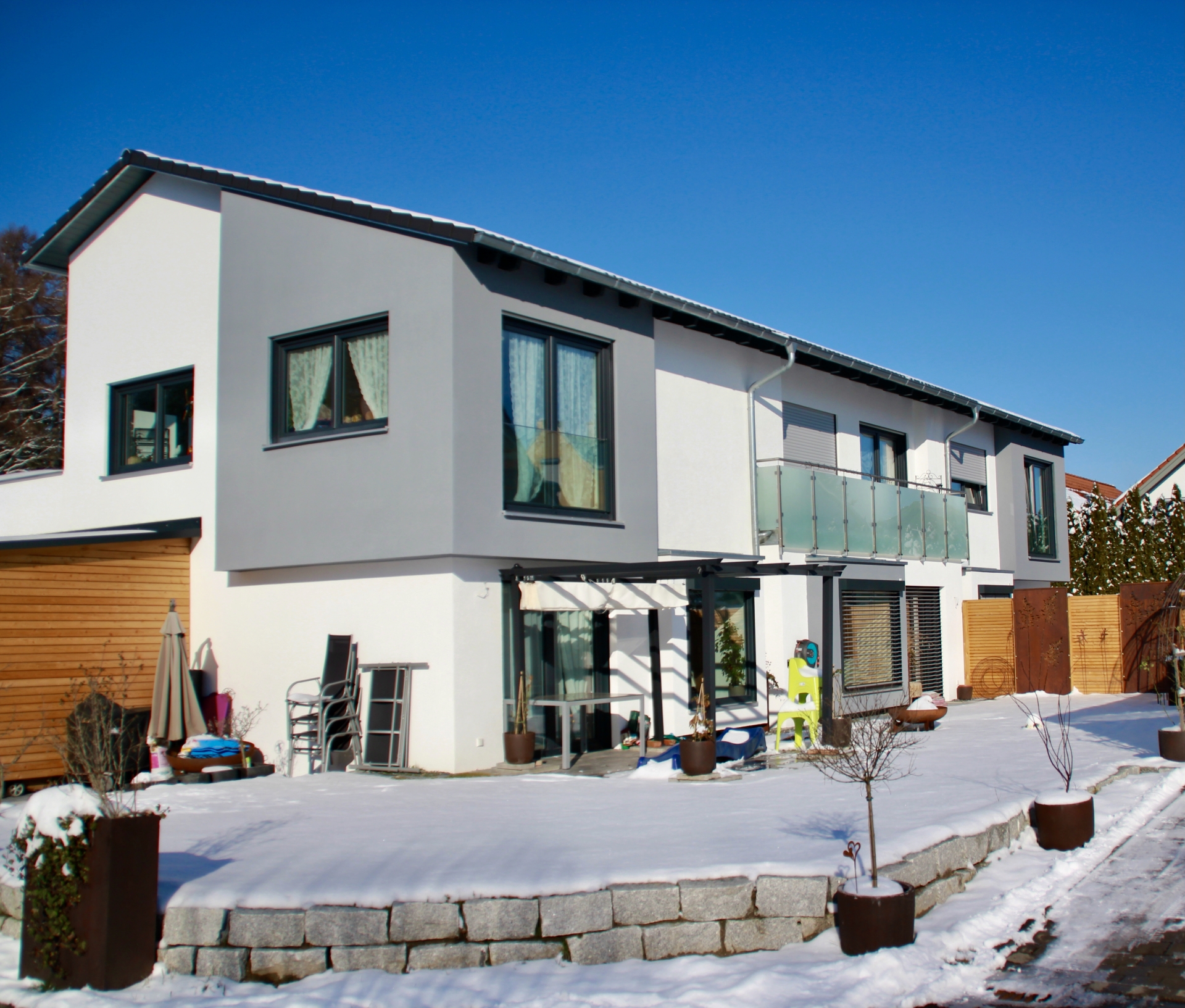 Die Terrassen im Erdgeschoss, Balkone im Obergeschoss laden zur seelischen Entspannung und Erholung ein. Die 3-fach verglasten Fenster, Videosprechanlagen und elektrische Rolläden sind nur wenige Dinge, die Ihr Wohlgefühl steigern lassen. Bei Sonderwünschen stehen wir Ihnen gerne beiseite und unterstützen Sie um Ihren Wohntraum noch schöner zu gestalten!