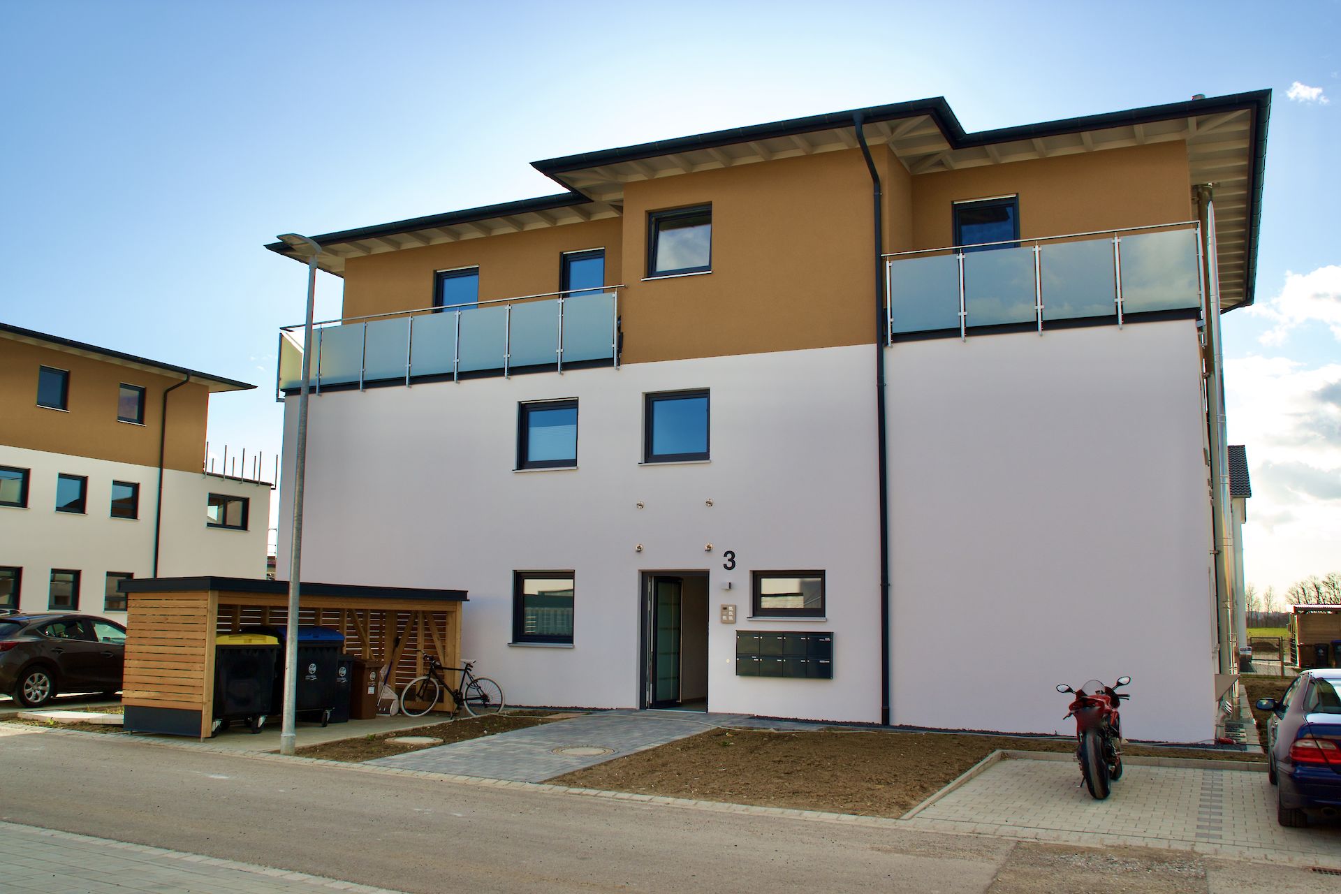 Die PKW-Außenstellplätze sind direkt am Haus positioniert. Die Einzelgaragen finden Sie auf der gegenüberliegenden Straßenseite vom Eduard-Mörike-Weg.