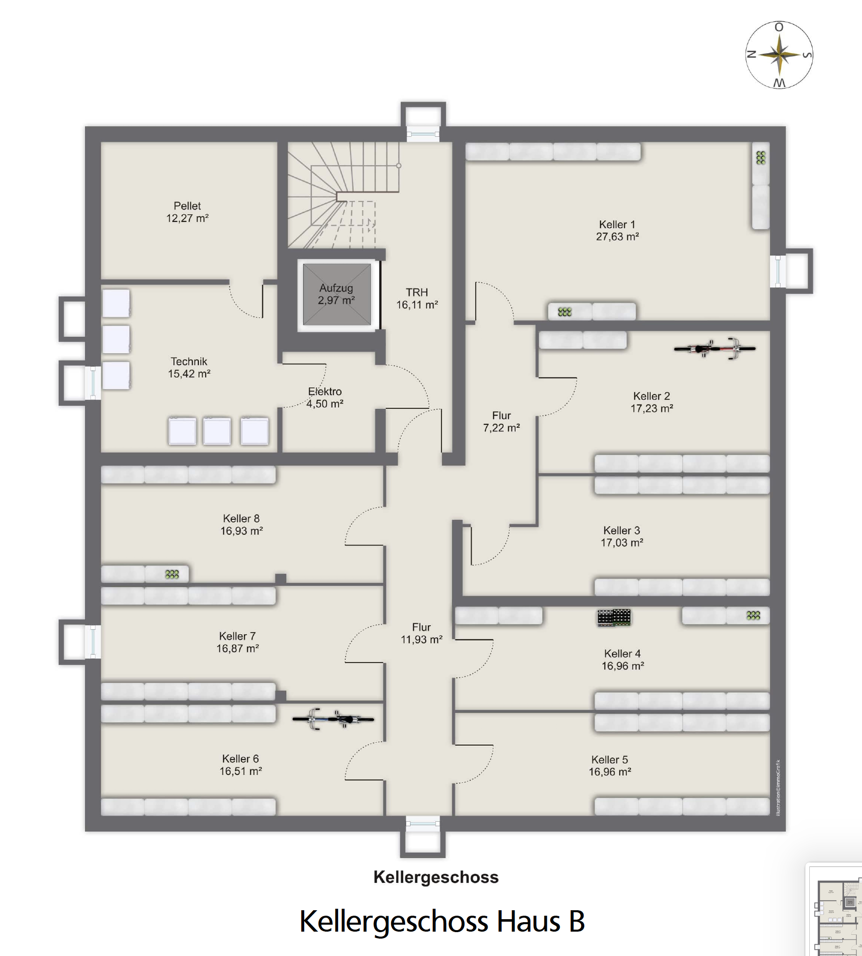 Die Kellerabteile 1-8 zu den jeweiligen Wohnungen 1-8.